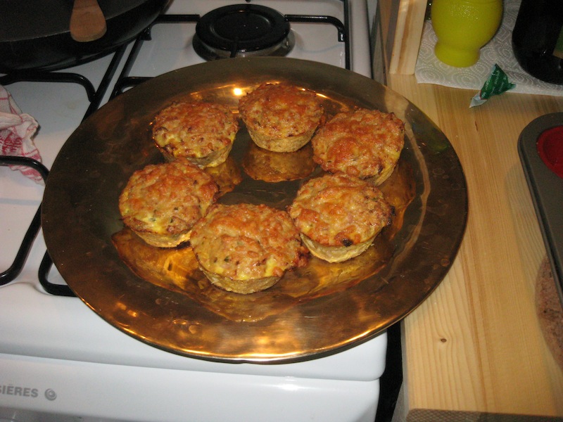 Un petit cake au thon-pesto avec du fromage gratiné sur le dessus, mais comme j'ai oublié qu'on avait pas de moule à cake (on vient d'emmenager ensemble) ca s'est transformé en pseudo muffins =)