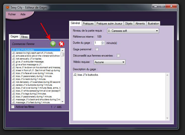 Voilà la partie intéressante du jeu : le fait de pouvoir ajouter ses propres gages ! En effet je n'ai pas répertorié toutes les pratiques possibles, donc en cas d'ajout de pratiques de votre part (voir tutorial créé pour cela) ou tout simplement l'envie d'ajouter des gages plus persos, cette partie va vous intéresser. ;)