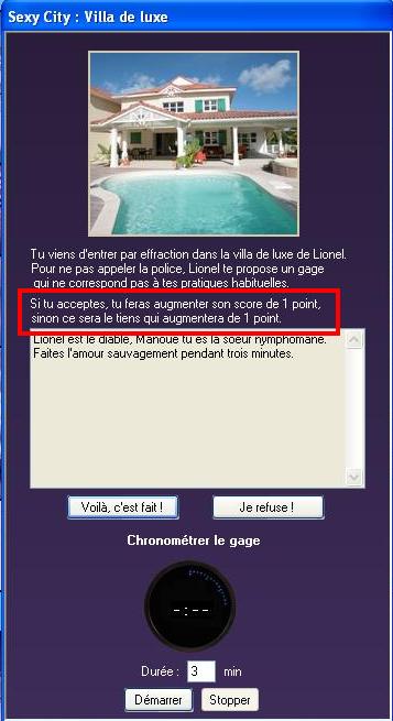 il me semble qu'il y a un bug au niveau des cases villas. En effet, lorsque l'on tombe sur ces cases, on a un gage que l'on peut refuser ou accepter. Si on accepte le partenaire prend un point et si on refuse c nous qui prenons un point. Pour ce qui est de l'acceptation, pas de prob. C'est lorsque l'on refuse que ça bug je pense, car j'ai constater que lors des refus les scores ne bougent pas.